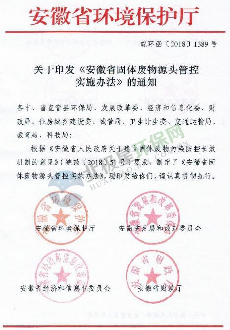 日前,安徽省發(fā)布《安徽省固體廢物源頭管控實施辦法》,詳情如下:關(guān)于印發(fā)《安徽省固體廢物源頭管控實施辦法》的通知各市、省直管縣環(huán)保局、發(fā)展改革委、經(jīng)濟(jì)和信息化委、財政局、住房城鄉(xiāng)建設(shè)委、城管局、衛(wèi)生計生委、交通運(yùn)輸局、教育局、科技局:根據(jù)《安徽省人民政府關(guān)于建立固體廢物污染防控長效機(jī)制的意見》(皖政〔...