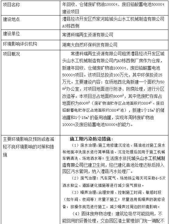 日前,湖南澧縣對(duì)年回收、倉儲(chǔ)廢礦物油10000t、廢舊鉛酸蓄電池50000t建設(shè)項(xiàng)目環(huán)境影響報(bào)告表進(jìn)行擬審批公示,詳情如下:年回收、倉儲(chǔ)廢礦物油10000t、廢舊鉛酸蓄電池50000t建設(shè)項(xiàng)目環(huán)境影響報(bào)告表擬審批公示經(jīng)審議,我局?jǐn)M于近日內(nèi)批準(zhǔn)《年回收、倉儲(chǔ)廢礦物油10000t、廢舊鉛酸蓄電池5000...