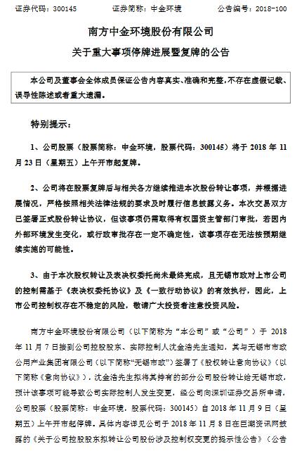 中金環(huán)境11月22日晚間公告,公司實(shí)際控制人沈金浩擬將1.28億股股份(占公司總股本的6.65%)轉(zhuǎn)讓給無錫市政,轉(zhuǎn)讓價(jià)格為4.42元/股,交易作價(jià)5.65億元。此外,沈金浩擬通過表決權(quán)委托方式將剩余股份中2.33億股股份對(duì)應(yīng)的表決權(quán)委托給無錫市政,占公司總股本的12.13%。交易完成后公司控股股東...