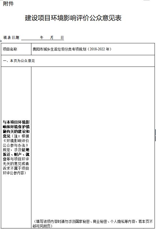 貴陽(yáng)市城鄉(xiāng)生活垃圾分類專項(xiàng)規(guī)劃(2018-2022年)環(huán)境影響評(píng)價(jià)公眾參與信息公示根據(jù)《中華人民共和國(guó)環(huán)境影響評(píng)價(jià)法》、《環(huán)境影響評(píng)價(jià)公眾參與辦法》(生態(tài)環(huán)境部令 第4號(hào))規(guī)定,現(xiàn)就貴陽(yáng)市城鄉(xiāng)生活垃圾分類專項(xiàng)規(guī)劃(2018-2022年)環(huán)境影響評(píng)價(jià)信息進(jìn)行第一次公示,歡迎公眾積極參與并提出寶貴意見(jiàn)。...