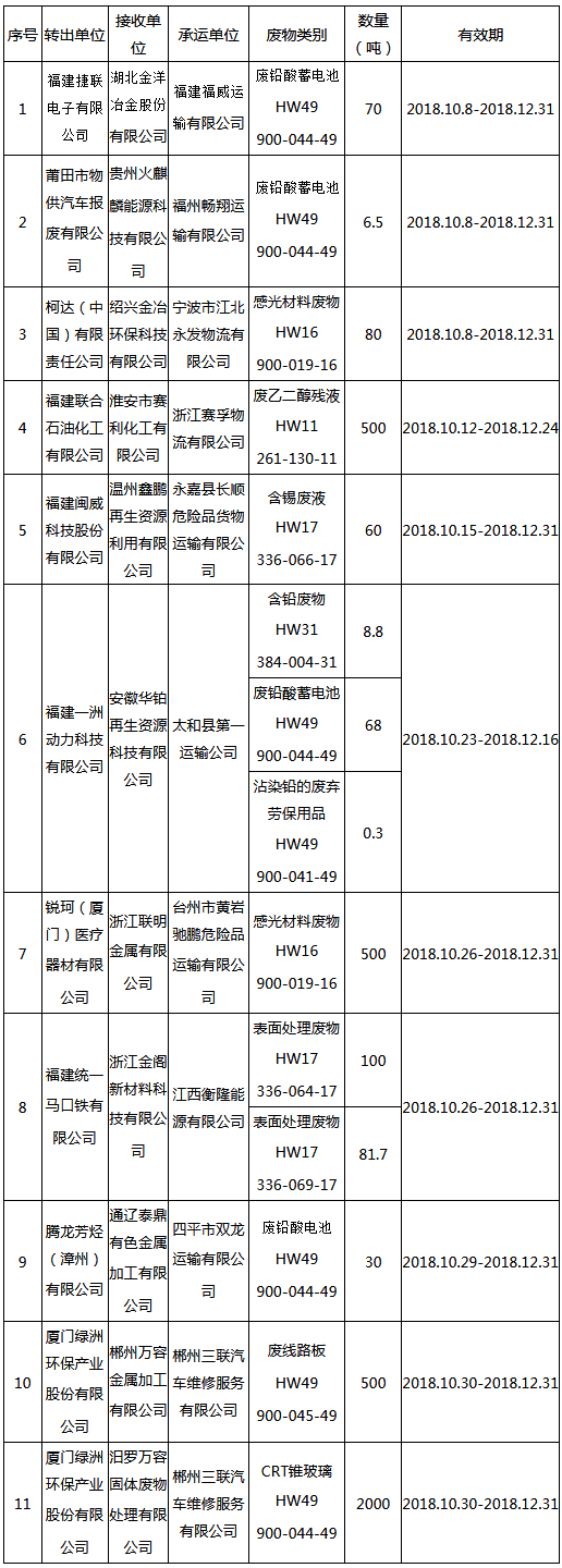 日前福建省環(huán)境保護廳發(fā)布了《2018年10月福建省危險廢物跨省轉移情況公告》,共有11項,具體內容如下: