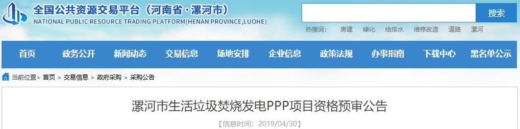 近日,河南漯河市2250噸/日生活垃圾焚燒PPP項(xiàng)目資格預(yù)審結(jié)果公示,經(jīng)評(píng)審小組評(píng)定,在遞交資格預(yù)審申請(qǐng)文件的8家申請(qǐng)人中,共有7家符合資格預(yù)審條件。名單如下(排名不分先后)山東省工業(yè)設(shè)備安裝集團(tuán)有限公司北京高能時(shí)代環(huán)境技術(shù)股份有限公司河南城發(fā)環(huán)境股份有限公司中電建寧夏工程有限公司協(xié)鑫智慧能源股份有...