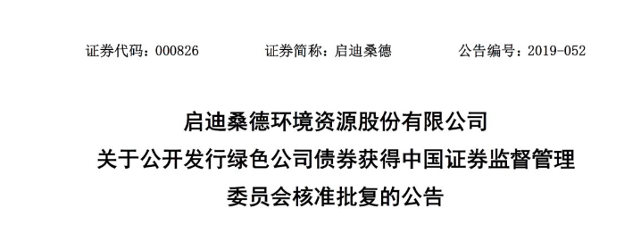日前,中國(guó)環(huán)聯(lián)網(wǎng)獲悉,啟迪桑德發(fā)布公告稱,公司擬發(fā)行不超過50億綠色公司債已經(jīng)獲得證監(jiān)會(huì)批復(fù)。詳情如下:2019年4月30日,啟迪桑德環(huán)境資源股份有限公司(以下簡(jiǎn)稱“公司”)收到中國(guó)證券監(jiān)督管理委員會(huì)(以下簡(jiǎn)稱“中國(guó)證監(jiān)會(huì)”)出具的《關(guān)于核準(zhǔn)啟迪桑德環(huán)境資源股份有限公司向合格投資者公開發(fā)行綠色公司債...