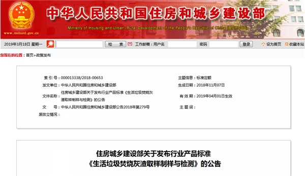 日前住房城鄉(xiāng)建設(shè)部發(fā)布了行業(yè)產(chǎn)品標(biāo)準(zhǔn)《生活垃圾焚燒灰渣取樣制樣與檢測》,編號為CJ/T531-2018,自2019年4月1日起實(shí)施。具體內(nèi)容如下:現(xiàn)批準(zhǔn)《生活垃圾焚燒灰渣取樣制樣與檢測》為城鎮(zhèn)建設(shè)行業(yè)產(chǎn)品標(biāo)準(zhǔn),編號為CJ/T531-2018,自2019年4月1日起實(shí)施。本標(biāo)準(zhǔn)在住房城鄉(xiāng)建設(shè)部門戶網(wǎng)站...