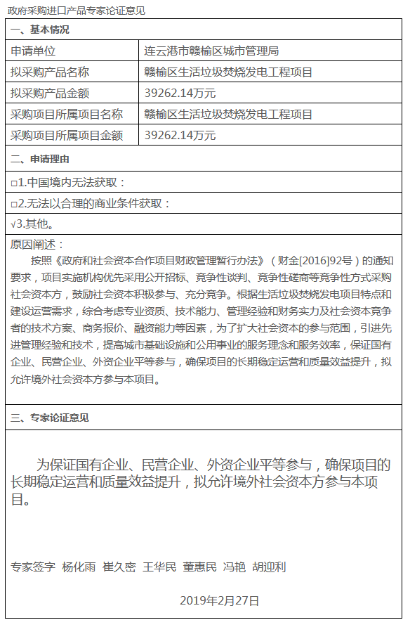 日前江蘇政府采購網(wǎng)發(fā)布了《贛榆區(qū)生活垃圾焚燒發(fā)電工程PPP項(xiàng)目境外社會資本采購專家論證》,論證意見為,按照《政府和社會資本合作項(xiàng)目財政管理暫行辦法》(財金[2016]92號)的通知要求,項(xiàng)目實(shí)施機(jī)構(gòu)優(yōu)先采用公開招標(biāo)、競爭性談判、競爭性磋商等競爭性方式采購社會資本方,鼓勵社會資本積極參與、充分競爭。根...