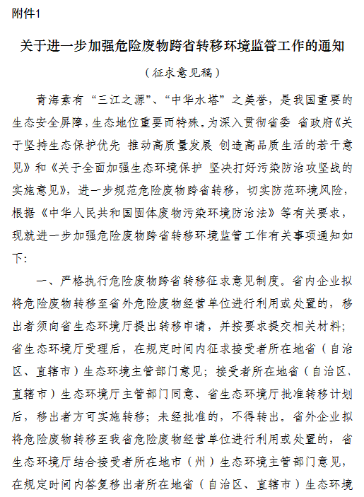 關(guān)于征求《關(guān)于進(jìn)一步加強(qiáng)危險廢物跨省轉(zhuǎn)移環(huán)境監(jiān)管工作的通知(征求意見稿)》意見建議的函各市(州)生態(tài)環(huán)境局,省固體廢物污染防治中心、省環(huán)境保護(hù)綜合行政執(zhí)法監(jiān)督局,相關(guān)危險廢物產(chǎn)生、經(jīng)營單位:為強(qiáng)化危險廢物跨省轉(zhuǎn)移環(huán)境監(jiān)管,切實(shí)防范環(huán)境風(fēng)險,青海省生態(tài)環(huán)境廳草擬了《關(guān)于進(jìn)一步加強(qiáng)危險廢物跨省轉(zhuǎn)移環(huán)境監(jiān)...