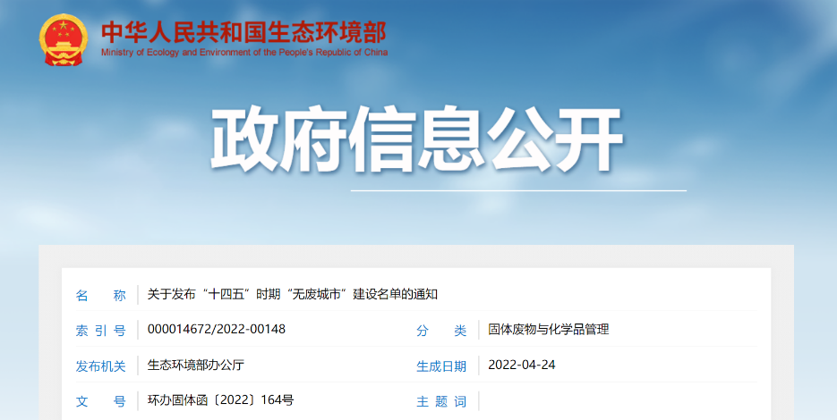 關于發(fā)布“十四五”時期“無廢城市”建設名單的通知各省、自治區(qū)、直轄市生態(tài)環(huán)境廳(局): 為落實《中共中央 國務院關于深入打好污染防治攻堅戰(zhàn)的意見》和《“十四五”時期“無廢城市”建設工作方案》(以下簡稱《工作方案》),我部會同有關部門,根據(jù)各省份推薦情況,綜合考慮城市基礎條件、工作積極性和國家相關重大...
