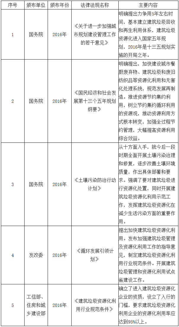 隨著城鎮(zhèn)化腳步的加速,每年我國(guó)有越來(lái)越多的建筑新建和重建,這些新建和重建的過(guò)程便會(huì)產(chǎn)生大量的建筑垃圾。對(duì)于環(huán)境的污染造成了極大地?fù)p害,建筑垃圾造成的環(huán)境問(wèn)題日益嚴(yán)重。我國(guó)建筑垃圾行業(yè)政策由于我國(guó)對(duì)于城市建筑垃圾堆放及處理問(wèn)題的逐步重視和環(huán)保投入的不斷增加,我國(guó)政府和立法機(jī)關(guān)密集出臺(tái)一系列法律法規(guī)和發(fā)...