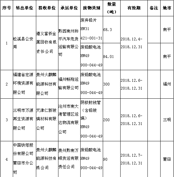 日前福建省環(huán)境保護廳發(fā)布了《2018年12月福建省危險廢物跨省轉移情況公告》,共有24項,具體內容如下: