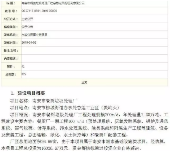 2019年1月2日,南安市政公用事業(yè)管理局發(fā)布兩份《社會(huì)穩(wěn)定風(fēng)險(xiǎn)征詢(xún)意見(jiàn)公示》,主要內(nèi)容關(guān)于南安市生活垃圾焚燒發(fā)電廠提級(jí)改造,以及南安市餐廚垃圾處理廠建設(shè)兩項(xiàng)工程。具體如下:南安市生活垃圾焚燒發(fā)電廠提級(jí)改造工程項(xiàng)目位于柳城街道杏蓮工業(yè)區(qū)(美嶺頭),提級(jí)改造后日處理垃圾量將達(dá)到每日1500噸,年處理量...