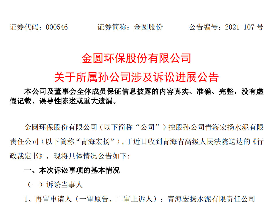 因為5萬元的環(huán)保處罰,導致3655萬元稅收優(yōu)惠沒有了,是不是有點因小失大?2021年12月29日,金圓環(huán)保股份有限公司(下稱“金圓股份”)發(fā)布公告,宣布了一起所屬孫公司青海宏揚水泥有限責任公司(下稱“青海宏揚”)涉及訴訟的進展,青海宏揚要求確認環(huán)保處罰無效的再審申請被法院駁回。這意味著,經(jīng)歷了一審、...