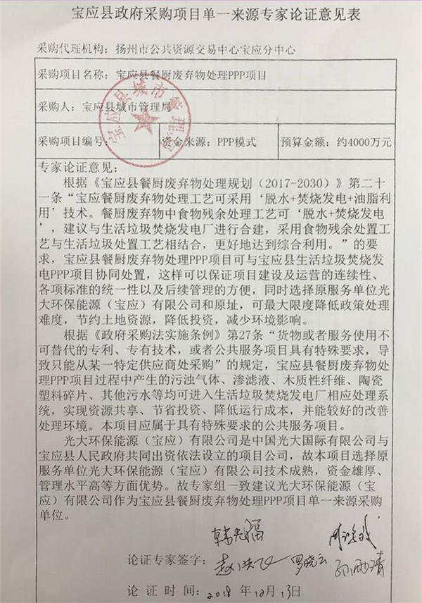 揚州市公共資源交易中心寶應(yīng)分中心受寶應(yīng)縣城市管理局的委托,就其所需的寶應(yīng)縣餐廚廢棄物處理PPP項目進行政府采購。根據(jù)本項目的特殊情況及采購人的申請,經(jīng)專家論證對其擬采用的單一來源采購方式,相關(guān)內(nèi)容公示如下:1、論證人員名單姓名 工作單位韓光福 住建部可持續(xù)發(fā)展與資源環(huán)境專家委員會孫雨清 蘇州市環(huán)衛(wèi)處...