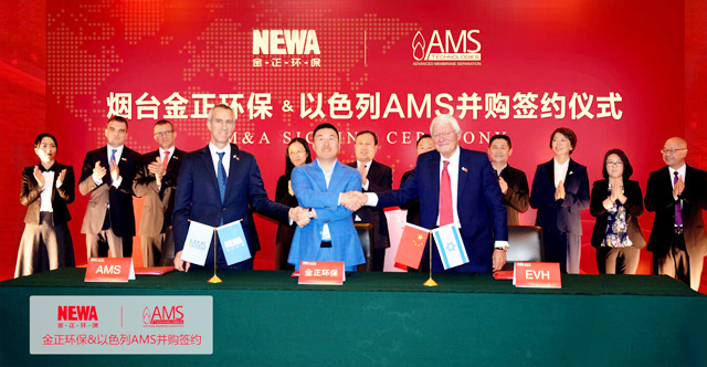 儀式上,在煙臺市政府領導、煙臺市環(huán)保局領導、煙臺市萊山區(qū)領導及長期以來支持金正環(huán)保的金融界等合作伙伴共同見證下金正環(huán)??偛美钤奖胂壬MS公司原股東Johannes Sittard博士以及AMS公司CEO Gil Meron成功簽訂并購協(xié)議。