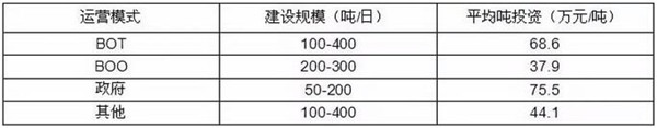 從不同運(yùn)營(yíng)模式來(lái)看,相對(duì)政府投資而言,BOT、BOO模式建設(shè)成本明顯更低,且由于很多小規(guī)模的處理設(shè)施采用政府投資或BOT模式建設(shè),導(dǎo)致這兩種模式的平均噸投資大幅高于BOO模式。