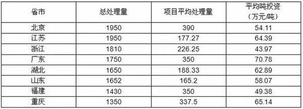 目前各地區(qū)設(shè)施建設(shè)能力相差較大,但單座設(shè)施平均規(guī)模相差不大,總處理量排名前六的省市分別為北京、江蘇、浙江、廣東、山東和湖北,其項(xiàng)目處理量占全部處理量的41.7%,說(shuō)明對(duì)餐廚項(xiàng)目需求相對(duì)較強(qiáng)。除上述6省市外,項(xiàng)目處理量前8位的省市還包括福建和重慶。從區(qū)域分布來(lái)看,除湖北外,其它7省市均在沿海一帶或?yàn)橹陛犑?,說(shuō)明經(jīng)濟(jì)發(fā)達(dá)城市對(duì)餐廚垃圾處理的重視程度較高。