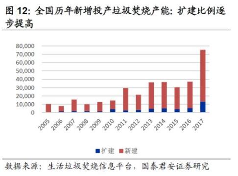 行業(yè)新增焚燒需求,主要來(lái)自城市化進(jìn)程以及原有城市環(huán)衛(wèi)服務(wù)開始覆蓋鄉(xiāng)鎮(zhèn)而收集面積增大。帶動(dòng)三四線城市新建項(xiàng)目以及原有項(xiàng)目的擴(kuò)建需求。從我們總結(jié)的數(shù)據(jù)來(lái)看: