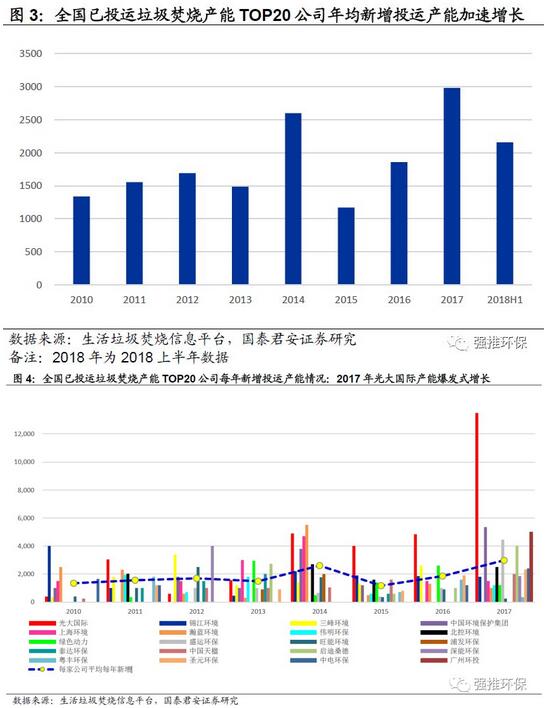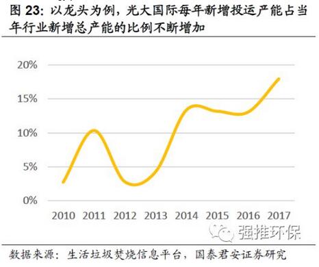 2017年,垃圾焚燒行業(yè)龍頭公司,光大國(guó)際新增垃圾焚燒產(chǎn)能占全行業(yè)當(dāng)年新增焚燒產(chǎn)能的18%,占比自2012年以來(lái)持續(xù)提升。