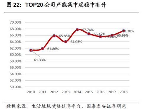隨著環(huán)保標(biāo)準(zhǔn)和監(jiān)管趨嚴(yán),具有品牌效應(yīng)、運(yùn)營(yíng)經(jīng)驗(yàn)、政府關(guān)系和資金實(shí)力的龍頭公司在拓展業(yè)務(wù)方面更具優(yōu)勢(shì),預(yù)計(jì)行業(yè)集中度有進(jìn)步一步提升趨勢(shì)。2010-2018上半年以來(lái),行業(yè)中投產(chǎn)產(chǎn)能TOP20的公司合計(jì)投產(chǎn)占全行業(yè)總產(chǎn)能的比例由61%上升到67%。