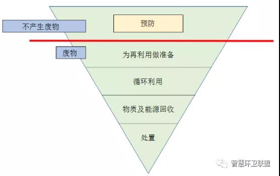 金字塔中的預(yù)防指:在設(shè)計和制造產(chǎn)品的過程中,盡量減少原料的使用量;延長產(chǎn)品的使用壽命;減少有害物質(zhì)的使用量。為再利用做準備指:對產(chǎn)品的整體或部件進行檢查、清理、修理、翻新等工作。循環(huán)利用指:使用廢物生產(chǎn)新的物質(zhì)或產(chǎn)品,包括堆肥。其他回收手段指:使用厭氧消化、焚燒發(fā)電、氣化等手段產(chǎn)生能量(包括燃料、熱、電)和一些物料(可以用作回填物)。處置指:填埋和沒有能量回收手段的焚燒。