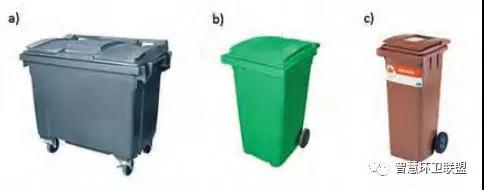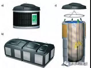 為了進行廢物的投放,產(chǎn)業(yè)所有者或物業(yè)管理公司應(yīng)當(dāng)為住宅提供生活垃圾的投放點。投放時采用的容器分為普通容器(更為常用)和埋入式容器(正在普及)兩種。常用的普通投放容器分別為140升(圖8中c)、240升(圖8中b)、600升(圖8中a)這三種。普通投放容器的缺點是,雖然容積不大,但卻會占據(jù)將對較大的空間。埋入式容器部分設(shè)置于地下,內(nèi)部配備高強度織物容納袋,容納能力遠高于普通容器,能夠在節(jié)省空間的同時,起到降低收運頻次的作用。收運時,收運車輛會將織物袋從容器中取出,通過打開袋底的機關(guān)清空廢物。