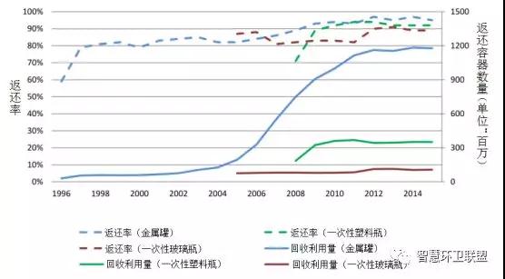 芬蘭的押金體系實現(xiàn)了極高的回收率。在PALPA體系剛剛成立的1996年,一次性金屬罐的回收率就已經(jīng)達到了59%,并馬上于第二年上升到了79%。到了2009年,金屬罐的回收率已經(jīng)超過90%。同樣地,PET瓶的押金體系在2008年開始實施時,返還率就已經(jīng)達到了71%,之后在兩年內(nèi)便上升到了90%以上。玻璃瓶在芬蘭擁有很長的押金制度實施積累,因此在PALPA在建立針對玻璃瓶的回收體系后,回收率就一直高于80%。從圖11還可以看出,一次性鐵罐的回收量自2004年起至2012年,一直都在迅速上升,并且保持穩(wěn)定的高回收率,反映出芬蘭飲料產(chǎn)業(yè)使用一次性金屬罐替代可重復(fù)使用玻璃瓶的趨勢。可重復(fù)使用玻璃瓶的回收率則更高,在2014年時為97%、2015年時為98%。