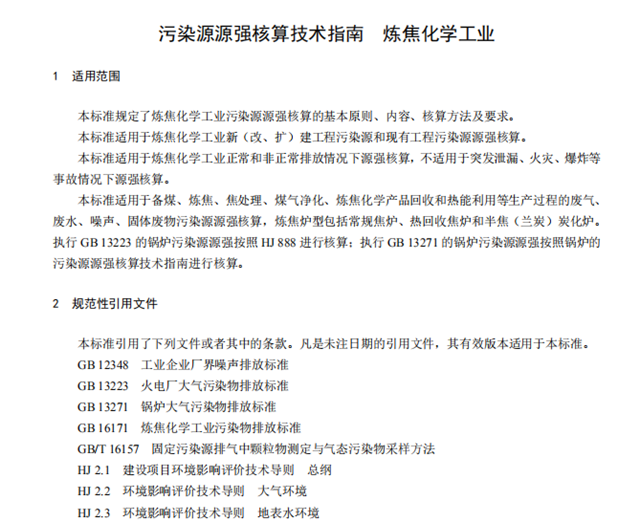本標(biāo)準(zhǔn)規(guī)定了煉焦化學(xué)工業(yè)廢氣、廢水、噪聲、固體廢物污染源強核算的基本原則、內(nèi)容、核算方法及要求等。