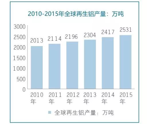 2010年全球再生鋁產(chǎn)量為2013萬噸,2015年增長至2531萬噸。