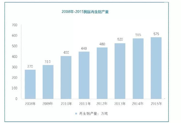 2008年中國再生鋁產(chǎn)量為270萬噸,近年來由于有道國家宏觀調(diào)控,各種能源可再生政策發(fā)布,以及我國“十二五”和“十三五”可持續(xù)發(fā)展的要求,我國鋁再生產(chǎn)業(yè)發(fā)展速度,2015年再生鋁產(chǎn)量達(dá)到了575萬噸,同時鋁再生平均增長率達(dá)到12.3%。
