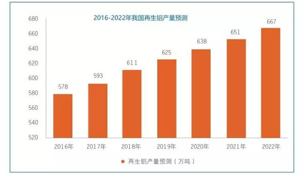 近年來,經(jīng)濟(jì)發(fā)展突飛猛進(jìn),隨之而來的便是節(jié)約資源、保護(hù)環(huán)境等要求,中國再生鋁企業(yè)受益迅速成長。2008年,再生鋁產(chǎn)量達(dá)到270萬噸,至2015達(dá)到575萬噸。由于受到國內(nèi)鋁市供需不平衡的影響,近幾年鋁價下降維持平穩(wěn),局部小反彈,大多數(shù)再生鋁企業(yè)利潤提升,再生鋁行業(yè)未來前景開始回升。按照2006年到2015再生鋁的增長趨勢,預(yù)計(jì)2016再生鋁產(chǎn)量達(dá)到578萬噸,2022年再生鋁產(chǎn)量達(dá)到667萬噸。