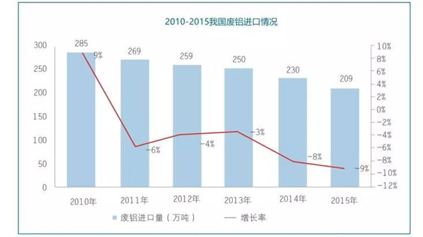 中國鋁儲存量雖然多,但是我國可持續(xù)發(fā)展戰(zhàn)略要鋁資源是需要循環(huán)利用的,所以我國不但國內(nèi)回收廢鋁,每年還會進(jìn)口回收國外的廢鋁,2010年我國廢鋁進(jìn)口285萬噸,同比增長9%。2015年我國進(jìn)口廢鋁209萬噸,同比下降9%。