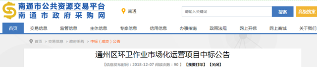 2018年12月7日,江蘇省南通市通州區(qū)環(huán)衛(wèi)作業(yè)市場(chǎng)化運(yùn)營(yíng)項(xiàng)目發(fā)布中標(biāo)公告,中國(guó)天楹股份有限公司(牽頭)和南通中宏環(huán)境發(fā)展有限公司組成的聯(lián)合體成功中標(biāo),中標(biāo)金額為9088.98萬/年,運(yùn)營(yíng)期限25年,合同期內(nèi)項(xiàng)目總金額達(dá)22.74億。