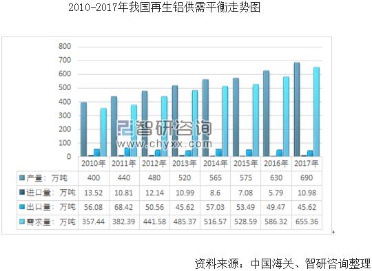 2008年中國(guó)再生鋁產(chǎn)量為270萬(wàn)噸,近年來(lái)由于有道國(guó)家宏觀調(diào)控,各種能源可再生政策發(fā)布,以及我國(guó)“十二五”和“十三五”可持續(xù)發(fā)展的要求,我國(guó)鋁再生產(chǎn)業(yè)發(fā)展速度,2017年再生鋁產(chǎn)量達(dá)到了690萬(wàn)噸,同時(shí)鋁再生平均增長(zhǎng)率達(dá)到10%。