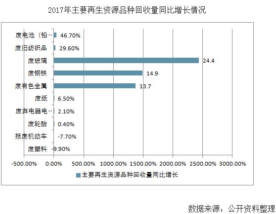 截至2017年底,我國廢鋼鐵、廢有色金屬、廢塑料、廢輪胎、廢紙、廢棄電器電子產(chǎn)品、報(bào)廢機(jī)動車、廢舊紡織品、廢玻璃、廢電池十大類別的再生資源回收總量為2.82億噸,同比增長11%。其中,廢電池、廢玻璃、廢舊紡織品回收量增幅較為明顯,分別增長46.7%、24.4%和29.6%;廢塑料和報(bào)廢機(jī)動車回收量出現(xiàn)下滑,分別同比減少9.9%和7.7%。
