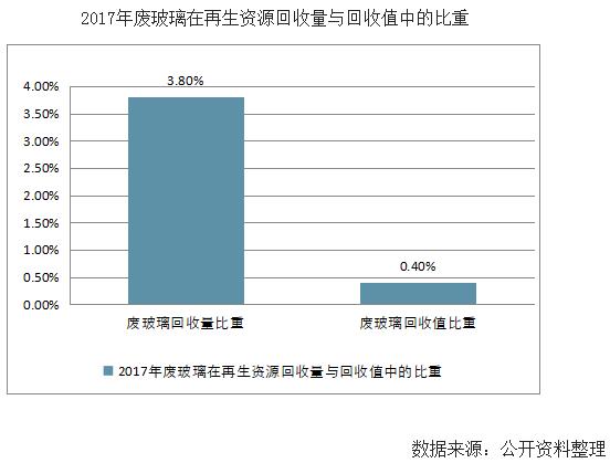 以廢玻璃為例,2017年廢玻璃回收量為1070萬噸,占回收總量的比重為3.8%;回收值為32.1億元,占回收總值的比重為0.4%。