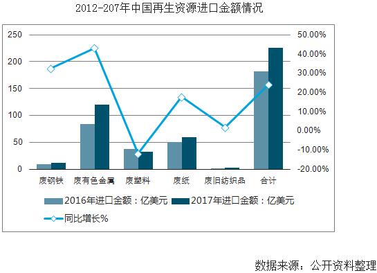 2017年,我國廢鋼鐵、廢有色金屬、廢塑料、廢紙、廢舊紡織品五大類別的再生資源進(jìn)口總量3620.9萬噸,同比下降9.9%。其中降幅最大的是廢塑料,同比下降20.7%。廢舊紡織品進(jìn)口量與2016年相比,減少6.2%。再生資源進(jìn)口量下降主要是由于《禁止洋垃圾入境推進(jìn)固體廢物進(jìn)口管理制度改革實(shí)施方案》等一系列政策對行業(yè)產(chǎn)生的影響逐漸顯現(xiàn)。