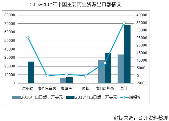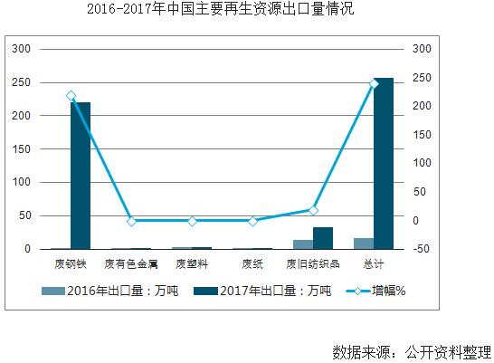 2017年,我國廢鋼鐵、廢有色金屬、廢塑料、廢紙、廢舊紡織品五大類別的再生資源共出口257.23萬噸,較上年增長239.92萬噸。其中,增加最多的是廢鋼鐵,較上年增加了220.19萬噸。原因方面,主要是由于政府取締“小作坊”式的中頻爐生產(chǎn)“地條鋼”,使得廢鋼鐵資源階段性過剩,出口成為消化過剩產(chǎn)能的新途徑。