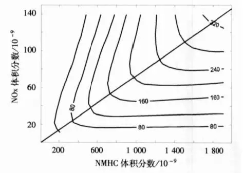 因此,當(dāng)二氧化硫超標(biāo),削減其排放就能達(dá)到減少污染的目的。但是,這種方法不能直接用于對臭氧的控制。學(xué)界認(rèn)為,臭氧治理需利用EKMA曲線,通過控制臭氧前體物NOx和VOCs來控制臭氧。