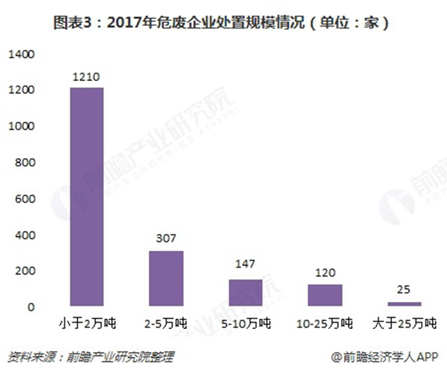 正因此,我國(guó)危廢處理行業(yè)參與者較多,但企業(yè)規(guī)模普遍較小。根據(jù)2017年7月的數(shù)據(jù)統(tǒng)計(jì),我國(guó)危廢處理企業(yè)產(chǎn)能低于2萬(wàn)噸、2-5萬(wàn)噸、5-10萬(wàn)噸、10-25萬(wàn)噸和25萬(wàn)噸以上的企業(yè)數(shù)量分別為1210家、307家、147家、120家和25家,67%的企業(yè)危廢處理產(chǎn)能低于2萬(wàn)噸。