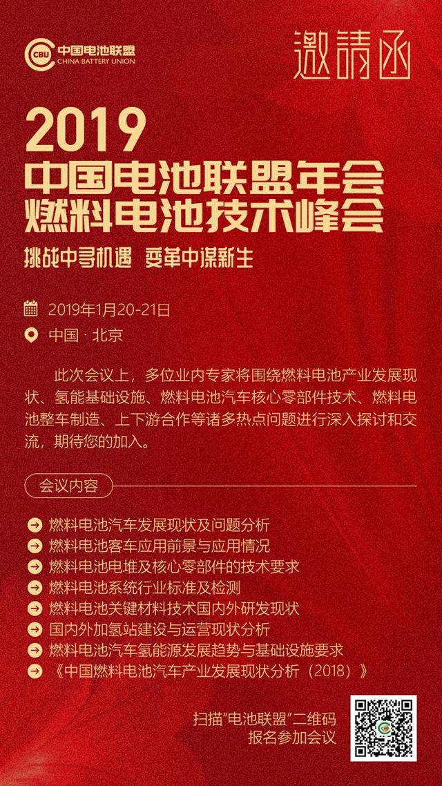2019年1月20至21日,中國電池企業(yè)聯(lián)盟年會暨全國氫燃料電池汽車產(chǎn)業(yè)技術(shù)峰會將在京召開。本次峰會由中國電池聯(lián)盟、中國電子節(jié)能技術(shù)協(xié)會電池專委會、中國高科技產(chǎn)業(yè)研究會、清華大學、北京理工大學聯(lián)合舉辦。