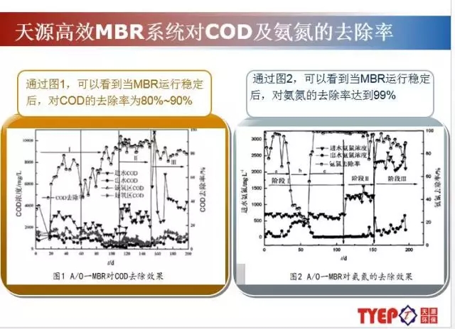 天源環(huán)保有10多年的深入摸索,對(duì)內(nèi)置式MBR,外置式MBR分別具備大量工程應(yīng)用,對(duì)其優(yōu)缺點(diǎn)很明顯,并且針對(duì)性解決各自的瓶頸問題。由上圖可以看到當(dāng)MBR運(yùn)行穩(wěn)定后,對(duì)COD的去除率為80%~90%,對(duì)氨氮的去除率達(dá)到99%。