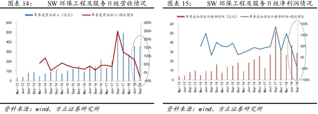 2018年二季度行業(yè)整體業(yè)績開始下滑。回顧2018年單季度業(yè)績情況,2018年一、二、三季度行業(yè)收入增速分別為101.35%、77.88%和-28.13%,扣非后凈利潤增速分別為107.23%、36.42%和-43.96%,可見2018年第二季度行業(yè)整體業(yè)績增速開始下滑,第三季度行業(yè)整體業(yè)績開始負(fù)增長。這與4月份以來PPP政策收緊、民企信用利差擴(kuò)大的環(huán)境變化一致。