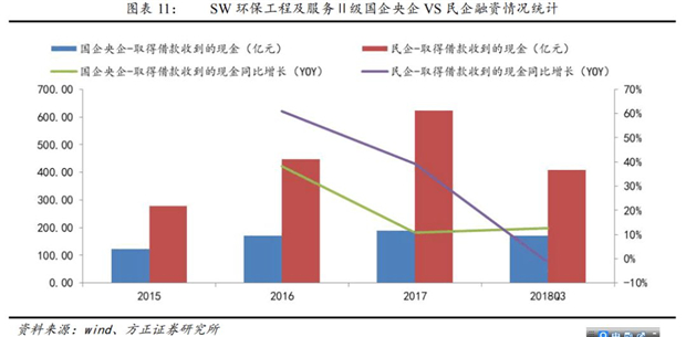 2018年民企融資陷入冰點(diǎn)。我們統(tǒng)計(jì)了SW環(huán)保工程及服務(wù)Ⅱ級公司的銀行借款情況,2018年前三季度國企和央企借款取得的現(xiàn)金規(guī)模171億元,同比增長13%;民營企業(yè)借款取得的現(xiàn)金規(guī)模407億元,同比下降2%??梢?,2018年國有企業(yè)從銀行借款未受到影響,但民營企業(yè)從銀行借款取得的現(xiàn)金規(guī)模明顯縮小。