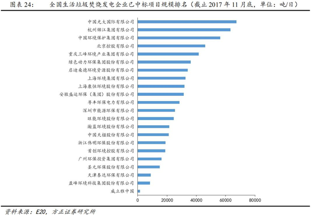 根據(jù)E20研究院統(tǒng)計(jì)排名,截止2017年11月底,已中標(biāo)的垃圾焚燒發(fā)電項(xiàng)目規(guī)模前五企業(yè)項(xiàng)目規(guī)模占比達(dá)到 42.26%,規(guī)模前十企業(yè)項(xiàng)目規(guī)模占比達(dá)到67.86%,行業(yè)市場集中度較高。