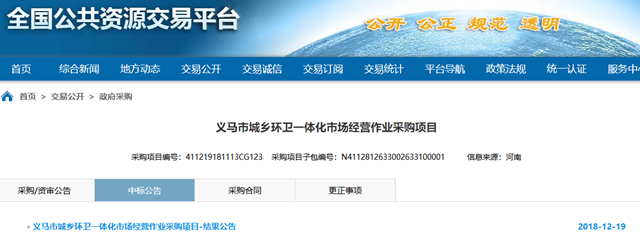2018年12月19日,河南省義馬市城鄉(xiāng)環(huán)衛(wèi)一體化市場經(jīng)營作業(yè)采購項目發(fā)布中標(biāo)公告,福建龍馬環(huán)衛(wèi)裝備股份有限公司成為中標(biāo)供應(yīng)商,中標(biāo)金額為1535.76萬/年。