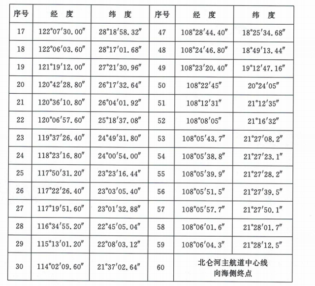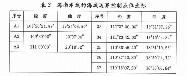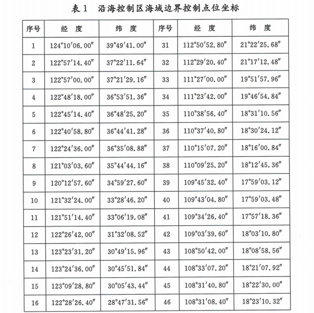 沿海控制區(qū)范圍為表1所列60個(gè)點(diǎn)依次連線以內(nèi)海域,其中海南水域范圍為表2所列20個(gè)點(diǎn)依次連線以內(nèi)海域。