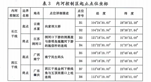 內(nèi)河控制區(qū)范圍為長(zhǎng)江干線(云南水富至江蘇瀏河口)、西江干線(廣西南寧至廣東肇慶段)的通航水域,起止點(diǎn)位坐標(biāo)見表3。