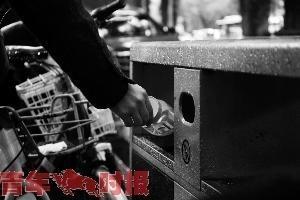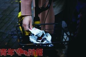 因周圍無(wú)垃圾桶,市民將垃圾暫放在自行車車籃內(nèi)。