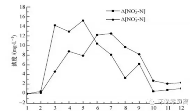 圖 3 UASB反應器出水NO2--N、NO3--N增加隨HRT變化情況