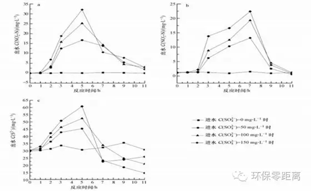 圖 7進水C(SO42-)對UASB反應咯呆全內(nèi)NO2--N、NO3--N、S2-指標隨反應時間變動的影響