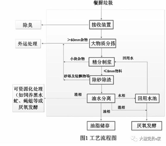 餐廚垃圾中的大塊金屬、瓷片、玻璃、塑料瓶蓋、貝殼、砂石、紙張等雜物被自動分揀出來,外運至生活垃圾焚燒發(fā)電廠。漿液經(jīng)加熱后分離出三種狀態(tài)的物料-水相、渣相、輕相(油水混合物料)。其中從輕相物料中分離出來的粗油脂儲運后可進一步加工制成生物柴油,作為飛機燃料使用;渣相物料,一路與水相進行調(diào)配做厭氧發(fā)酵,產(chǎn)生的沼氣可發(fā)電,另一路可用于資源化利用,如飼養(yǎng)黑水虻、蠅蛆等。